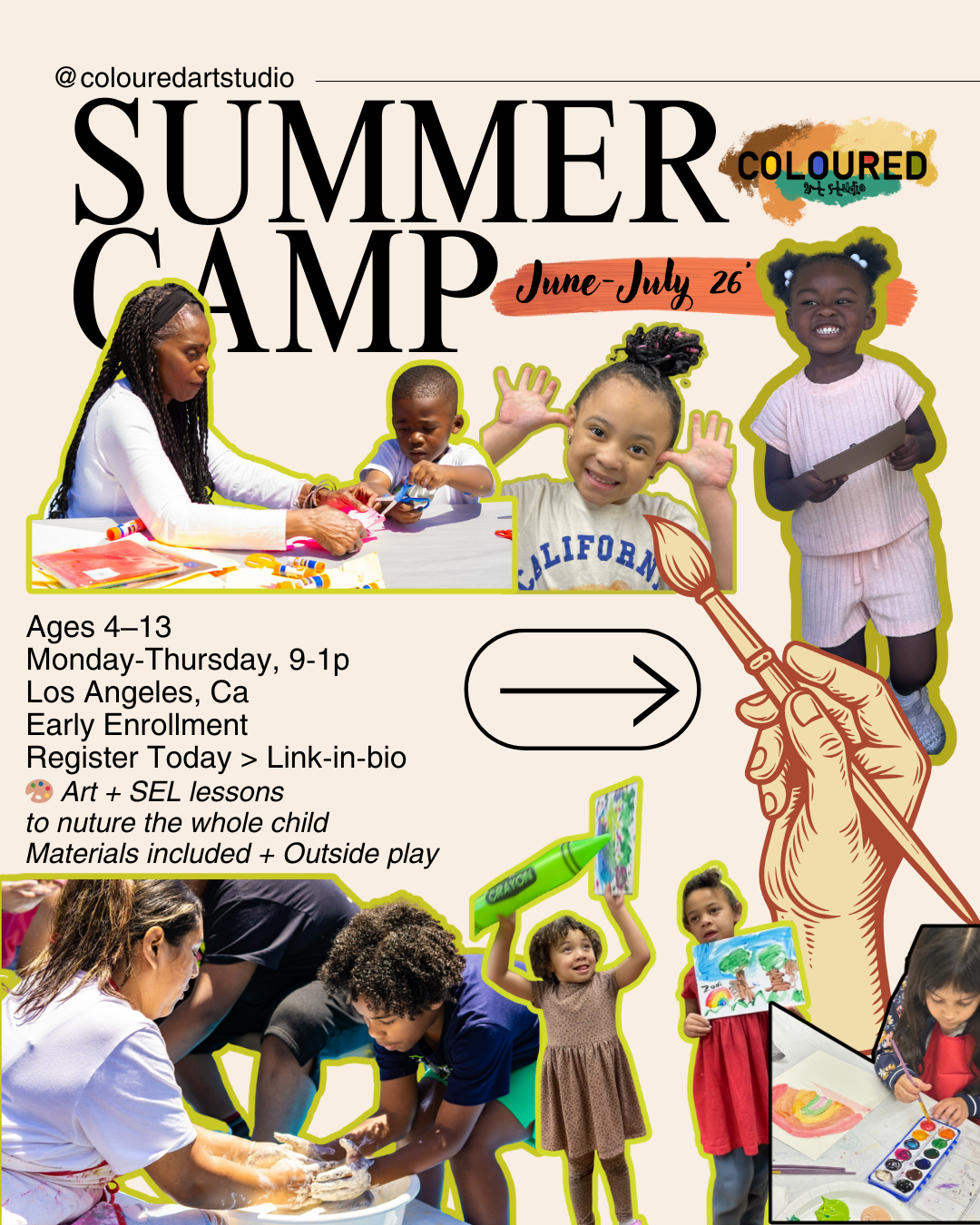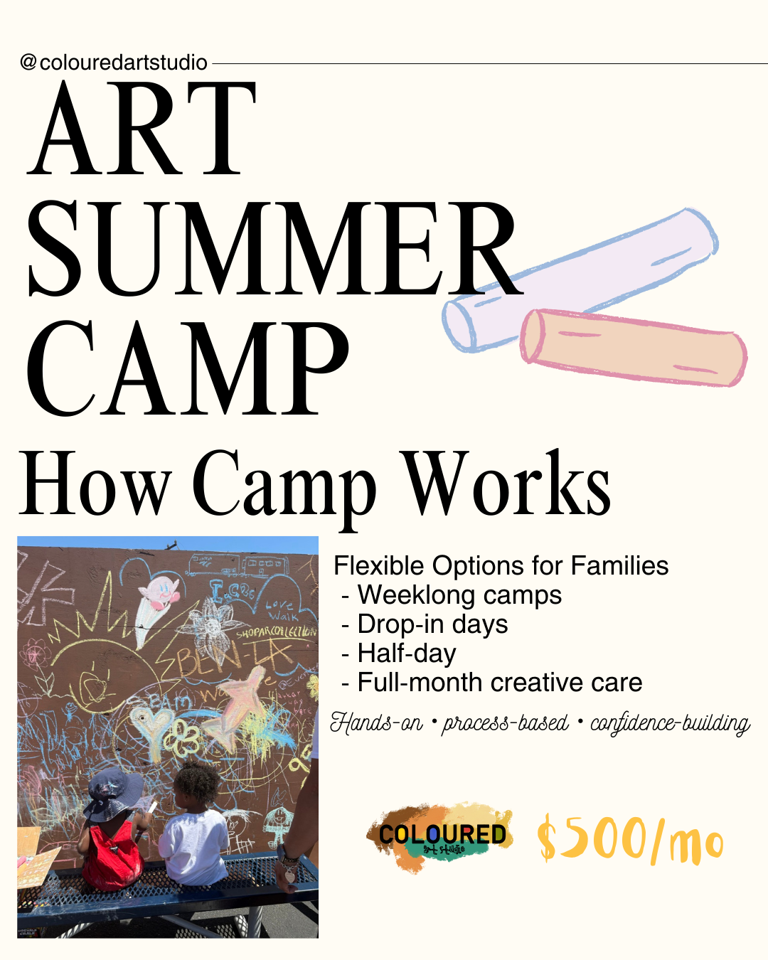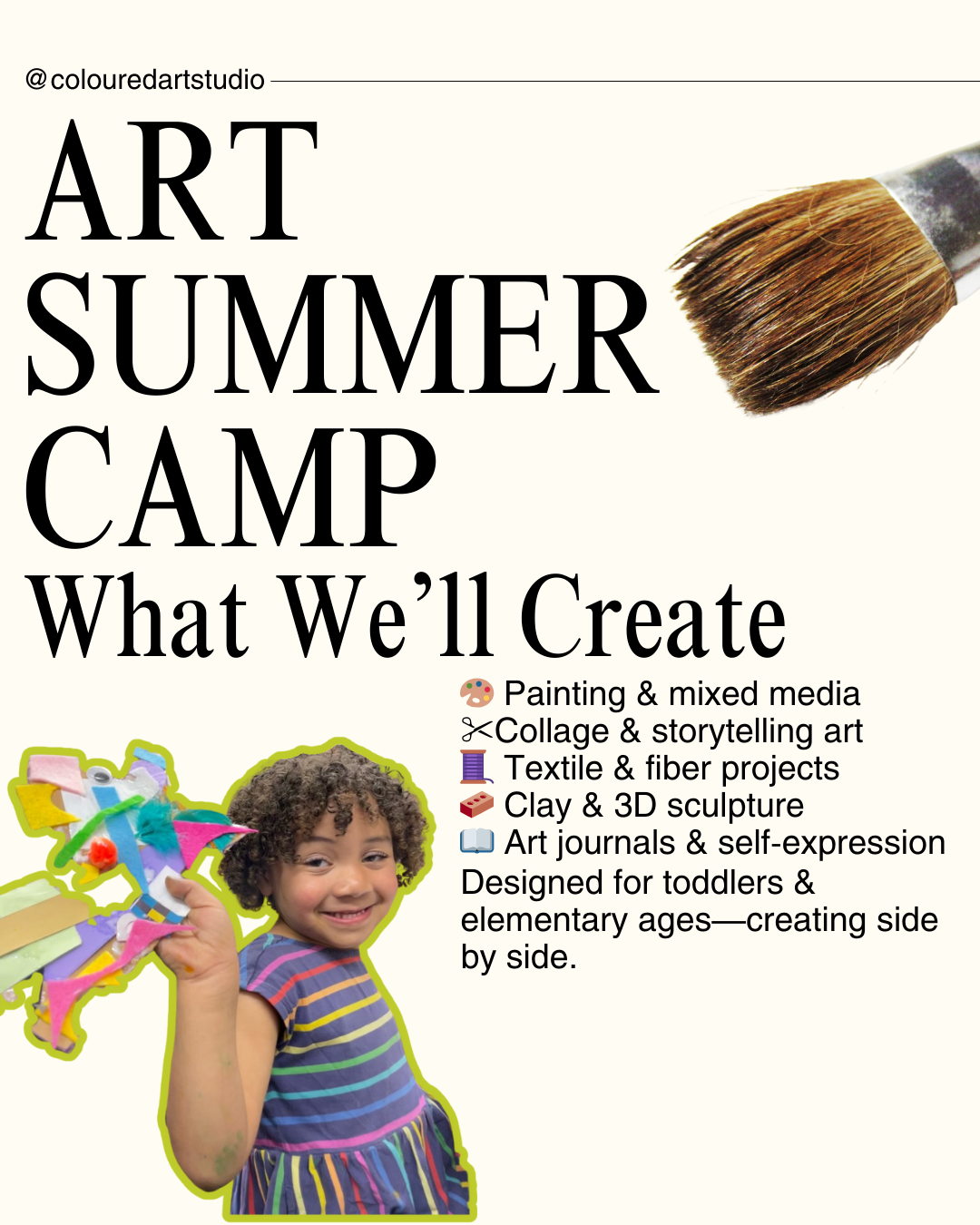 At Coloured Art Studio, camp isn’t just crafts — it’s confidence building, cultural learning, creative freedom, and whole-child growth. Your little artist will paint, sculpt, build, explore mixed media, learn about influential Black artists, and grow in community.